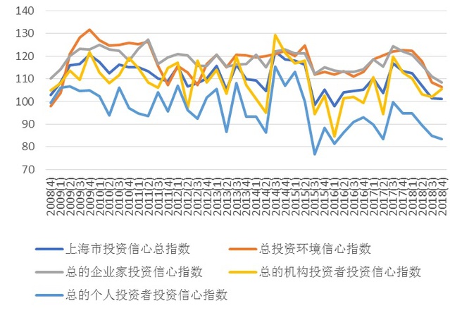 根据上海社会调查研究中心上财分中心和上海财经大学应用统计研究中心的调查,2018年第四季度上海市机构投资者信心指数为105.52点,比上季度上涨3.36点,比去年同期下降7.40点。表明本季度机构投资者对市场的看法较去年消极,但相比上季度有所好转。