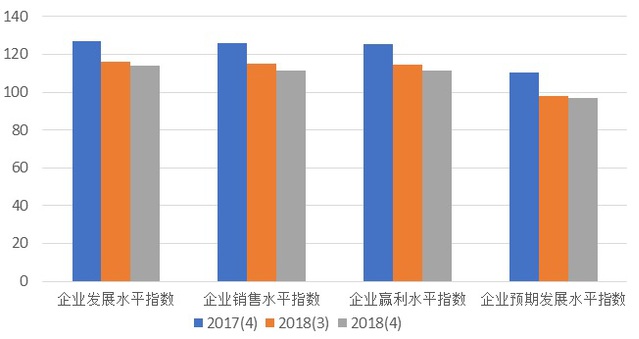 上海市企业家投资信心指数反映企业家对于本企业生产经营现状的满意程度和对未来的预期。如图4所示,本季度企业家投资信心指数的分类指数与上季度相比均有小幅下降。其中表现当前企业发展状况的企业发展水平信心指数为114.23点,与三季度相比下降1.76点,同比下降12.56;反映企业销售水平的企业销售水平信心指数是为111.55点,环比下降3.72点,同比下降14.28;企业盈利水平信心指数为111.53点,环比下降2.88,同比下降13.75点。企业预期发展水平信心指数为96.66点,较前一季度下降1.35点,同比下降13.65点,处于悲观区域,说明企业家对企业未来发展的预期依然悲观。