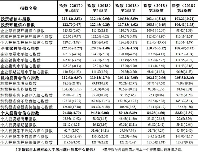 上海财经大学投资者信心指数2017年4季度-2018年4季度核心指数情况表