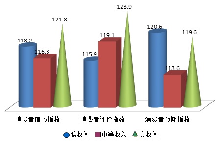 根据上海社会调查研究中心上财分中心和上海财经大学应用统计研究中心最新调查结果显示,不同收入群体的消费信心与以往呈现出不同的特点,本季度低收入群体消费者信心指数为118.2点,而中高收入群体分别为116.3点和121.8点;消费者评价指数的情况为:低收入群体为115.9点,中等收入消费者为119.1点,高收入消费者为123.9点,而消费者预期指数低中高收入群体分别为120.6点、113.6点和119.6点,各收入群体的主要指数环比大多上涨,特别是低收入群体上涨幅度最大。