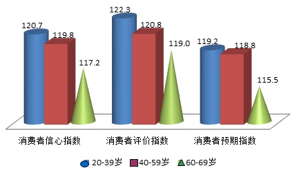上海社会调查研究中心上财分中心主任、上海财经大学应用统计研究中心主任徐国祥教授、吴纯杰教授和崔畅副教授分析指出,本季度分年龄段的调查结果显示,本季度20-39岁的青年消费者在三项主要指数中综合表现最好,依次分别为120.7点、122.3点和119.2点,环比分别增长了2.2点、2.6点和3.1点;而60-69岁的老年群体在本次调查中各项主要指数得分最低,分别为117.2点、119.0点和115.5点,而且相比上个季度变化出现了一定幅度的下跌,分别为3.9点、5.4点和2.3点;40-59岁的中年消费群体的各项主要指数居中,但环比亦为正,分别上升了3.9点、1.9点和5.9点。可见本季度老年消费群体的信心不足,对整体指数存在拉低效应,而中青年消费者既属于消费的主体同时也是社会的中坚力量,总体看这两个群体对收入和就业都给出了较好的评价和预期,特别是中年消费群体的两项购买指数均为正,这一方面传递了内需增长和经济向好的内在信号和动力,同时也应关注老年消费群体在收入和消费等方面的悲观情绪,作为弱势群体在医疗和养老照护等方面给予更多和更有效地保障。
