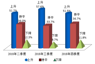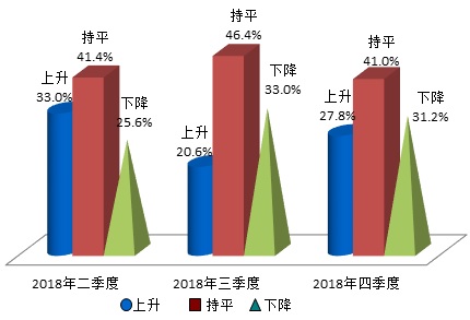 在通胀预期发生变化的同时,消费者对利率的判断也在随之调整,认为未来6个月利率“上升”的消费者同样有较大的增加,由20%上涨到了27.8%,幅度为7.2百分点,认为未来6个月内利率“会下降”的受访者较上个季度下降了1.8个百分点,为31.8%;相应的持“保持不变”的看法的比例由上季度的46.4%下降到41.0%,可见,消费者对未来物价变化的预期与对未来6个月内利率调整的预期并不同步,对此上海财经大学徐国祥教授和崔畅副教授指出,当前的经济金融环境较为复杂,美联储的加息预期一直存在,而国内一方面需要防范金融风险,同时在中美贸易摩擦中需保持汇率的相对稳定,因此利率不易出现大幅的波动,加息的可能性不大。