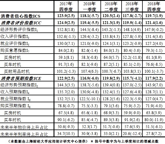 表一 2018年第四季度上海财经大学上海市消费者信心指数及分类指数
