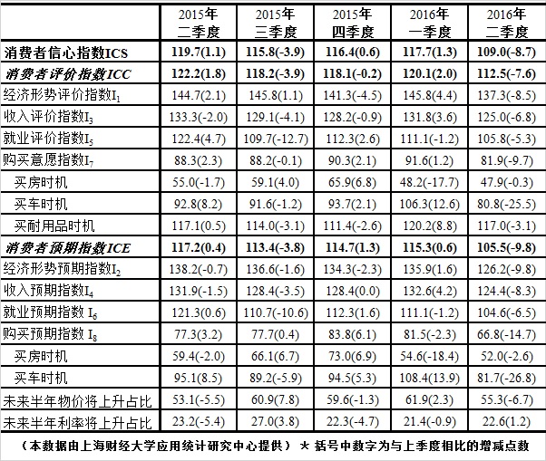 2016年第二季度上海财经大学上海市消费者信心指数及分类指数