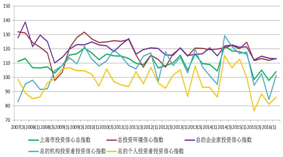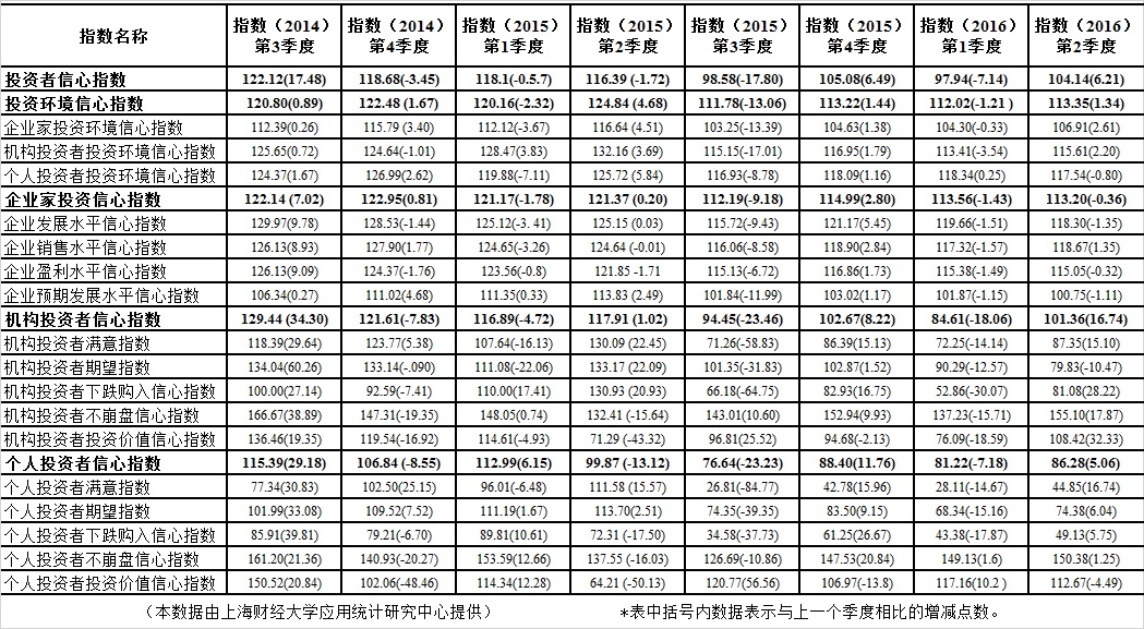 上海财经大学应用统计研究中心对上海市企业领导人或企业家、机构投资者和个人投资者的调查结果显示,2016年第二季度上海财经大学上海市投资者信心指数为104.14点,环比上升6.21点,同比降低12.24点。指数重回乐观区域,表明上海市投资者心态转向积极。
