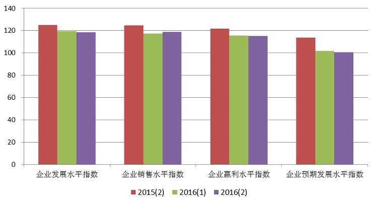 上海市企业家投资信心指数反映企业家对于本企业生产经营现状的满意程度和对未来的预期。如图3所示,本季度企业家投资信心指数的分类指数整体波动幅度较小,其中表现当前企业发展状况的企业发展水平信心指数为118.30点,较上季度降低1.35点,同比下降6.84点;反映企业销售水平的企业销售水平信心指数是为118.67点,环比上升1.35点,同比下降5.96点;企业盈利水平信心指数为115.05点,比一季度持平,同比下降6.80点。企业预期发展水平信心指数为100.75点,较前一季度降低1.11点,同比下降13.08点。