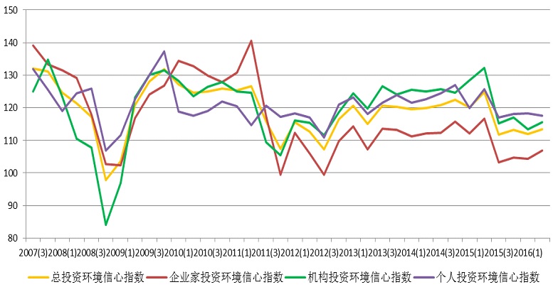 图2 上海财经大学2007年3季度至2016年2季度上海市投资环境信心指数图