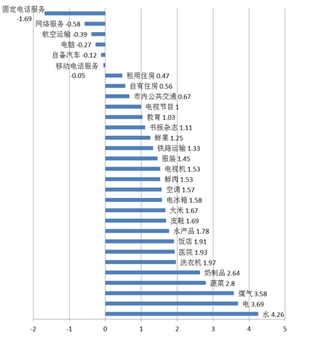 与2014年相比,2015年30个规格品满意度指数24升6降。其中,按照降幅由大到小排序,分别为:固定电话服务、网络服务、航空运输、电脑、自备汽车和移动电话服务。其满意度指数分别下降了1.69点、0.58点、0.39点、0.27点、0.12点和0.05点。这6个满意度指数下降的规格品中,除了电脑之外的5个规格品均属于交通和通信大类。这说明,交通和通信类满意度指数的下降受到上海市消费者对固定电话服务、网络服务、航空运输、自备汽车、移动电话服务满意度评价降低的综合影响,见图三。