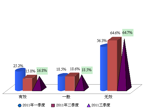 对比第三次调控以来的三个季度的调查结果可以发现,在本季度的调查中,16.8%的受访者认为房地产市场调控的政策有效,环比上升了1.0点,但相对调控之初的第一季度下降了8.4点;64.7%的消费者对该项工作的评价投了不满意票,与上季度基本持平,较第一季度恰好上升了8.4点。第三轮房地产市场的调控力度空前,而调控的效果至今尚不明显,因此消费者在期初对其的期待值之高导致了现在的不满情绪的滋生。消费者期待房地产市场借助此次调控能够建立长效性的调控政策体系和健康稳定发展的模式。