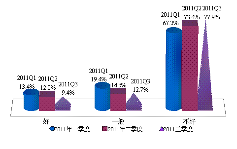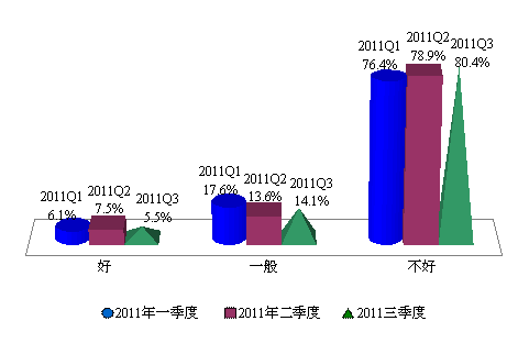 根据上海财经大学应用统计研究中心最新调查结果显示,消费者对于购房的消极情绪有所加剧,2011年第三季度上海市消费者买房意愿指数为25.1点,环比下降3.5点,购房时机预期指数35.1点,环比大幅下降7.1点,同比下降13.0点,形成了调查以来的最低点,反映了消费者期待第三轮调控能有一个较为长期的效果,但预期指数超过意愿指数10.0点,反映出购房者对于楼市调控效果具有一定的向好预期。