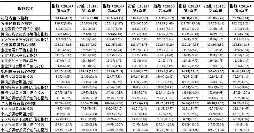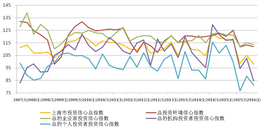 上海财经大学应用统计研究中心对上海市企业领导人或企业家、机构投资者和个人投资者的调查结果显示,2016年第一季度上海财经大学上海市投资者信心指数为97.94点,环比降低7.14点,同比降低20.16点。指数回落至悲观区域,表明上海市投资者心态转向消极。