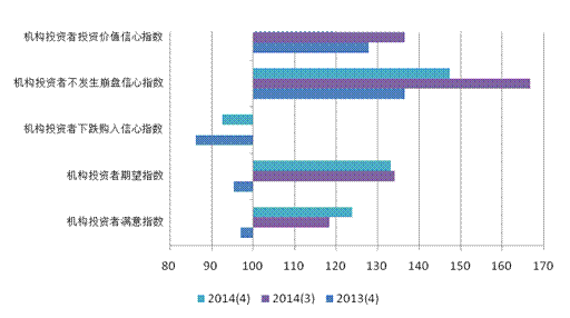 上海市社会经济指数系列课题组总负责人、上海财经大学应用统计研究中心主任徐国祥教授和常宁副教授分析指出,近期市场宽松的流动性和A股的强势上涨极大地提振了本季度机构投资者对投资的满意度。但是,随着沪指不断刷新近年新高,成交量、新增A股账户数以及融资融券余额等数据不断创下新纪录,机构投资者也表现出了对未来市场走势、投资价值以及投资风险等方面的担忧。因此,本季度机构投资者不发生崩盘信心指数和投资价值信心指数较上一季度均大幅回落,这一点值得关注。另一方面,作为中国内地资本市场史上力度最大的开放举措,沪港通在运行的一个多月中,表现较为平淡,引发了市场浓重的观望情绪,机构投资者对未来的看法呈现分歧。