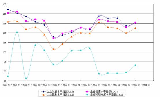 上海财经大学社会经济指数系列课题组总负责人、上海财经大学应用统计研究中心主任徐国祥教授分析指出,2011年我国将存在温和的通胀,全年通胀率预计为4.5%,高点将出现在第二季度。流动性存量较大、信贷惯性较大和外汇占款比重较高等因素使得2011年的物价上涨仍有较为充足的流动性基础。受春季干旱、输入型价格上涨、农业劳动力机会成本增加、国家粮食收购价格提高和大量闲散资金流入的影响,农产品价格在2011年可能会进一步上涨并推高整体物价。2011年美国等主要发达经济体将继续推行宽松货币政策,将进一步推高国际能源和金属等大宗原材料价格,这势必增加输入型通胀压力。但是,实体经济基本保持平衡,宏观调控政策的基调已回归稳健,因而2011年并不存在出现恶性通胀的基础。由此,表现当前企业发展状况的企业发展水平信心指数,企业销售水平信心指数、企业盈利水平信心指数和反映企业未来发展前景的企业预期发展水平信心指数本季度环比均出现了不同幅度的上升。