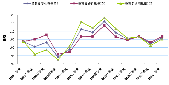 根据上海财经大学应用统计研究中心的最新调查结果显示,2011年第一季度上海财经大学上海市消费者信心指数为106.0点,环比上升3.8点,同比下降3.0点。其中,消费者评价指数为106.8点,较上季度上升3.6点,同比上升0.3点。消费者预期指数为105.2点,环比上升3.9点,同比回落6.4点。各季度上海财经大学上海市消费者信心指数的具体指数值参见附表一。各项指数在2009年第四季度达到峰值后,在2010年各季度基本上持续回落,本年度第一季度略有所上升,说明消费者对于经济发展的信心有所增强。上海财经大学应用统计研究中心主任徐国祥教授分析指出,虽然一系列影响经济发展的各种不确定因素逐步显现,但洋溢着民生气息的政策和两会议题,以及各种宏观调控政策和措施的出台和落实,提升了消费者对一季度经济发展形势的信心。