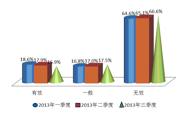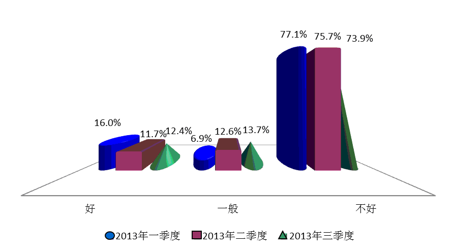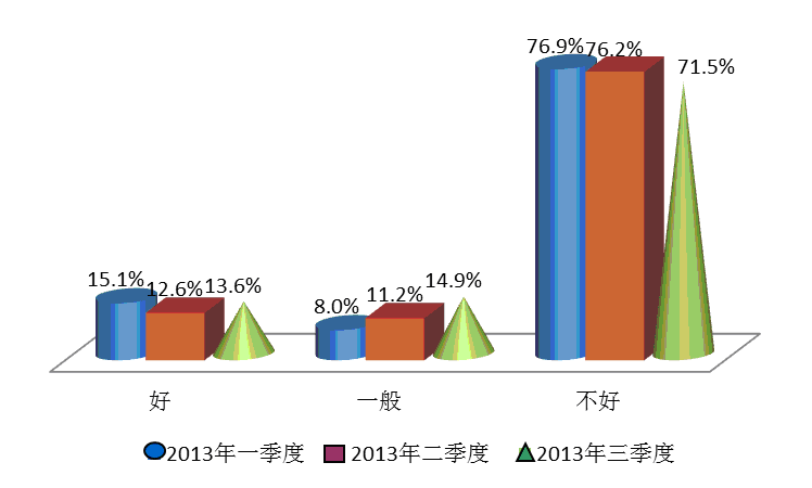 在本季度的调查中,15.9%的受访者认为房地产市场调控的政策有效,环比下降2.0个百分点,有66.6%的消费者对该项工作的评价投了不满意票,比上季度增加了1.5个百分点。