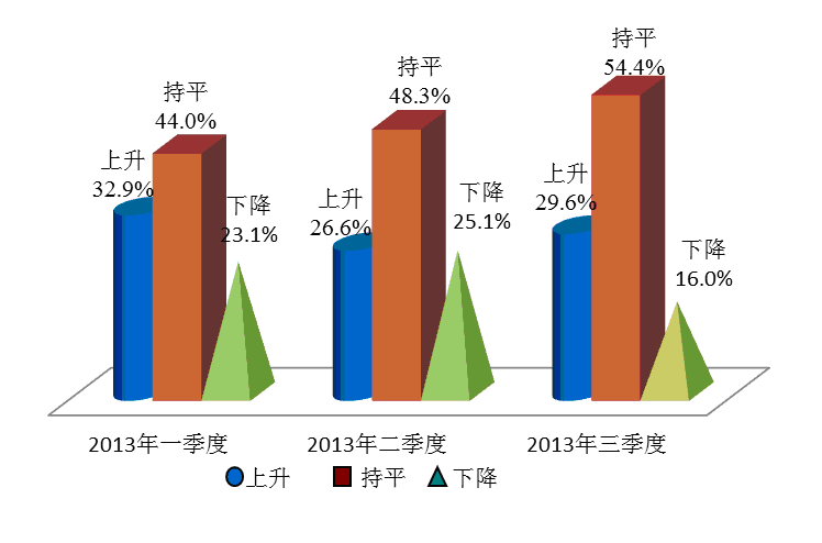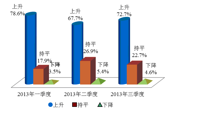本次调查中,在被问及未来半年物价走势时, 72.7%的受访者选择了“会上升”,相对于上季度上升5.0个百分点,同比下调3.7个百分点;选择“基本持平”的受访者占比为22.7%,比上个季度下降了4.2个百分点;而选择“会下降”的占比为4.6%,比上季度下降0.8个百分点。2013年9月上海开始施行水价阶梯加价方案以及本季度以来油价持续上涨和油品升级带来的附加成本等因素都是造成消费者对未来物价走强的预期。上海财经大学