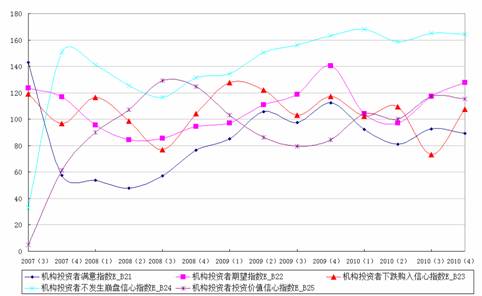 图13 上海财经大学2007(3)—2010(4)年各个季度机构投资者信心指数各分指数运行情况图