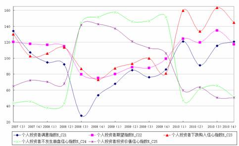 图14 上海财经大学2007(3)—2010(4)年各个季度个人投资者信心指数各分指数运行情况图