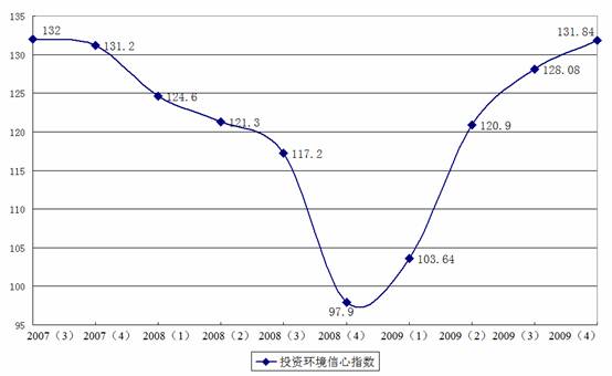 根据上海财经大学应用统计研究中心对上海市投资者的调查,2009年第四季度上海市投资环境信心指数为131.84点,在上季度上升的基础上继续上升了3.76点,同比较大幅度上升了33.94点,呈现较明显的乐观状态。具体见下图2。