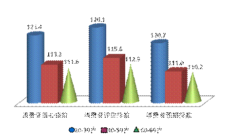 在分年龄段的调查中,20—39岁年龄组的消费者信心指数、消费者评价指数和消费者预期指数的数值最高,分别为123.4点、126.1点和120.7点,反映出年轻消费者对经济发展预期的乐观态度,而60—69岁年龄组的指数是最低的,分别为111.6点、112.9点和110.2点,而且同比和环比变化都不大,该年龄段的主要指数总体来看相对较为稳定。进一步分析发现,本季度40—49岁年龄组的消费者信心指数、消费者评价指数和消费者预期指数环比出现了负增长,与整体调查结果相背离,主要指数出现负增长的原因在于就业评价指数、就业预期指数和购买预期出现了大幅下滑,环比分别下降了8.8点、7.8点和4.9点,该年龄段的消费者属于消费心理较为谨慎的群体,要面临子女教育、父母医疗和预防储蓄动机等各项支出,尤其是就业压力的增加,更限制了其消费愿望。因此在经济结构转型期,应针对该群体的就业现状,采取相应的配套和保障措施,从整体上提振消费者对经济发展的信心,增强其消费能力。