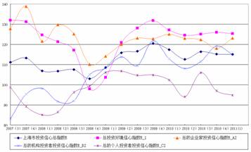 上海财经大学应用统计研究中心对上海市企业领导人或企业家、机构投资者和个人投资者的调查结果显示,2011年第一季度上海财经大学上海市投资者信心指数为115点,与上季度基本持平,同比下降了2.4点,总体仍然偏向乐观。