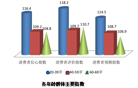 在本季度的分年龄段的调查中,20—39岁的消费者在三项主要指数(消费者信心指数、消费者评价指数、消费者预期指数)中得分最高,分别为116.4点、118.2点和114.5点,反映出年轻消费者对经济发展预期的乐观态度,同时该年龄段的消费者由于刚性需求强,就业能力强于中高年龄群体,购买意愿和购买动机指数最高,分别为85.7点和72.4点;而60—69岁年龄组的总指数是最低的,为108.8点,尤其是购买意愿指数和购买预期指数出现了大幅下滑,其中购买意愿指数74.6点,环比下降7.9点,购买预期指数46.3点,环比下降13.6点,均已接近历史最低点,而且调查数据显示,该年龄段对收入的评价和预期也处于各年龄段的低点,分别为123.2点和121.9点,可见对于老年消费者的消费需求和对经济的信心要加大提升力度,虽然该年龄段的消费者并不是拉动内需的主要动力,但保护老年消费者的购买力和幸福感是社会责任和社会进步的体现。