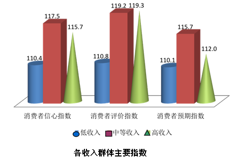 根据上海财经大学应用统计研究中心最新调查结果显示,消费者的消费信心随不同收入水平和不同年龄段呈现出不同水平。本季度低收入群体消费者信心指数为110.4点,而中高收入群体分别为117.5点和115.7点;消费者评价指数的情况为低收入群体为110.8点,中等收入消费者为119.2点,高收入消费者为119.3点,而消费者预期指数低中高收入群体分别为110.1点、115.7点和112.0点。各主要指数打破了以往依收入水平从低到高递增的态势,总体来看中等收入群体信心最强,但低收入群体的消费信心和对经济的评价以及预期环比增幅最大,且再次站到了中性值之上。