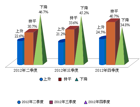 在通胀预期发生变化的同时,消费者对利率的判断在随之调整,认为未来6个月利率“保持不变”的消费者同样有较大的增加,幅度为7.1点。具体的,认为未来6个月内利率“会上升”的受访者由上季度的21.2%上升到24.5%,幅度为3.3点;持“保持不变”的看法的比例由上季度的33.6%上升到40.7%;而34.8%的受访者认为未来6个月内利率会下降,下降了10.4个百分点。