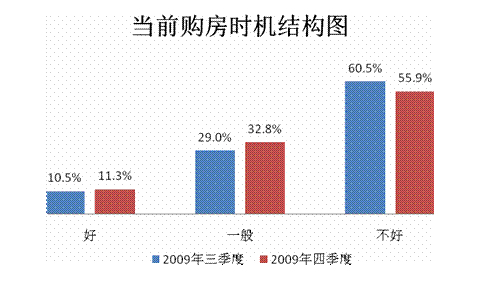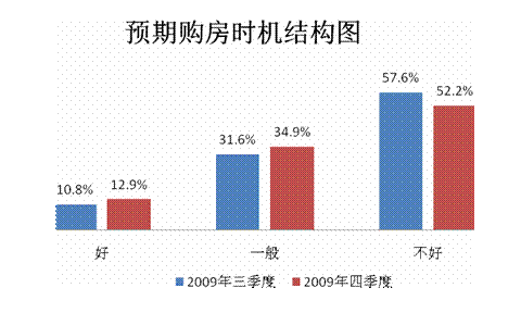 我国在二季度经济开始企稳,呈现V字型反转,楼市也全面回暖,房价持续高涨,各地不断涌出地王现象,在下半年严重打击了消费者的购房热情,对高昂的房价造成了恐惧感,从而转入观望状态。在第四季度的被访者中,只有11.2%认为当前购房时机“好”,环比增加了0.7个百分点;认为时机“不好”的占有55.9%,比上期下降了4.6个百分点。有52.2%的人对未来半年的购房时机不看好,环比下降了5.4个百分点。