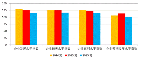 上海市企业家投资信心指数反映企业家对于本企业生产经营现状的满意程度和对未来的预期。如图3所示,本季度企业家投资信心指数的分类指数全面回落,其中表现当前企业发展状况的企业发展水平信心指数为115.72点,较上季度降低9.43点,同比下降14.25点;反映企业销售水平的企业销售水平信心指数是为116.06点,环比降低8.58点,同比下降10.07点;企业盈利水平信心指数为115.13点,比二季度下滑6.72点,同比下降11点。企业预期发展水平信心指数为101.84点,环比降低11.99点,同比下降4.5点,是分类指数中降幅最大的一个。