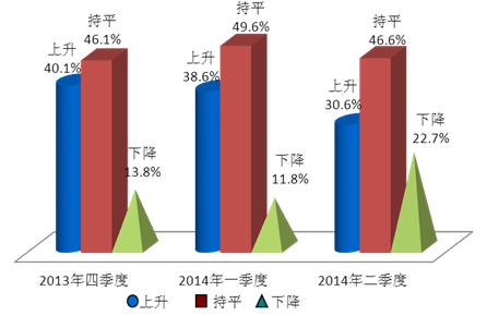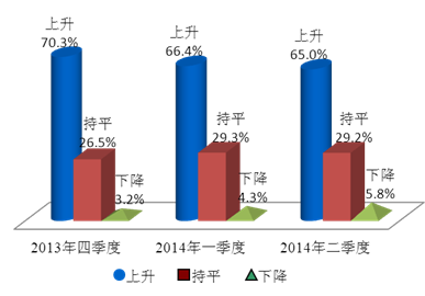 上海财经大学应用统计研究中心对2014年第二季度上海财经大学上海市消费者信心指数的调查结果显示,消费者对未来物价继续上涨的预期基本稳定,环比略有下降。