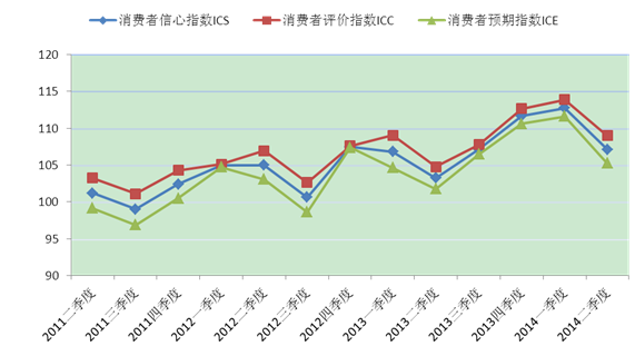 | 消费者评价指数ICC | 104.7(-4.3) | 107.8(3.1) | 112.7(4.9) | 113.9(1.2) | 109.0(-4.9) |