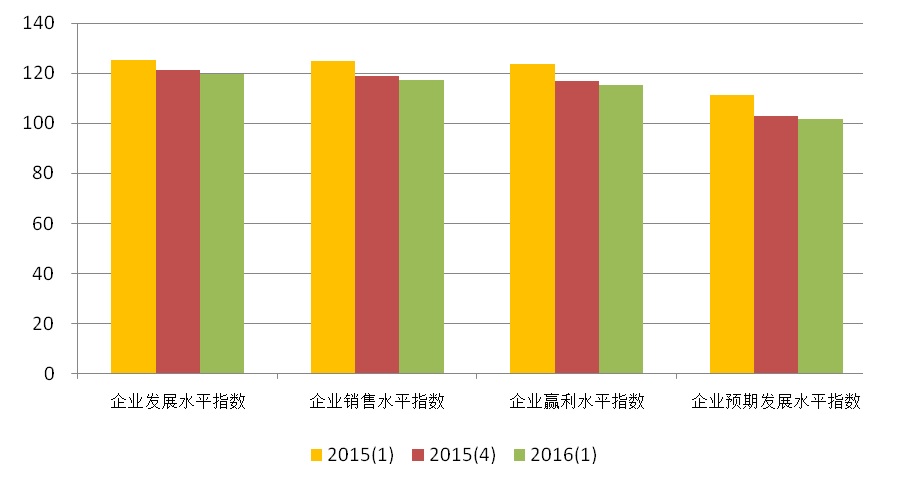 上海市企业家投资信心指数反映企业家对本企业生产经营现状的满意程度和对未来的预期。如图3所示,本季度企业家投资信心指数的分类指数全面小幅回落,其中表现当前企业发展状况的企业发展水平信心指数为119.66点,较上季度降低1.51点,同比下降5.46点;反映企业销售水平的企业销售水平信心指数是为117.32点,环比降低1.57点,同比下降7.32点;企业盈利水平信心指数为115.38点,比去年第四季度降低1.49点,同比下降8.19点;企业预期发展水平信心指数为101.87点,环比降低1.15点,同比下降9.48点。
