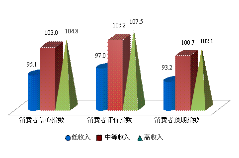 根据上海财经大学应用统计研究中心最新调查结果分析显示,消费者的消费信心相对不同收入水平而表现出不同的特点,本季度出现随收入增加而递增的趋势,且都出现较大幅度的下滑。本季度上海市低、中、高收入者的消费信心指数分别为95.1点、103.0点和104.8点,消费者评价指数的情况为:低收入群体为97.0点,中等收入消费者为105.2点,高收入消费者为107.5点。而消费者预期指数低、中、高收入群体分别为93.2点、100.7点和102.1点,与上季度相比均有较大幅度下调,其中,低收入消费者消费信心调整明显,各主要指数均下降到中性值100点以下,其与高收入消费群体的差值分别为9.7点、10.5点和8.9点,对此现象应给予必要的关注。