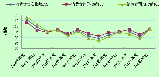 2011年 四季度 2012年 一季度 2012年 二季度 2012年 三季度 2012年 四季度 消费者信心指数ICS 102.4(3.4) 104.9(2.5) 104.9(0.0) 100.6(-4.4) 107.5(6.8) 消费者评价指数ICC 104.3(3.2) 105.1(0.8) 106.9(1.8) 102.6(-4.3) 107.6(4.9) 经济形势评价指数I1 122.7(4.6) 121.1(-1.6) 124.2(3.1) 114.1(-10.1) 124.6(10.5) 收入评价指数I3 118.5(1.9) 123.5(5.0) 121.6(-1.9) 120.8(-0.8) 122. 4(1.6) 就业形势评价指数I5 102.6(0.1) 105.6(3.0) 105.7(0.1) 100.8(-4.9) 101.6(0.8) 购买意愿指数I7 73.3(6.0) 70.2(-3.1) 76.2(6.0) 74.8(-1.4) 81.7(6.9) 买房时机 34.7(9.6) 29.6(-5.1) 39.2(9.6) 36.4(-2.8) 42.1(5.7) 买车时机 73.9(8.4) 74.2(0.3) 71.2(-3.0) 71.4(0.2) 81.4(10.0) 买耐用品时机 111.3(-0.2) 106.8(-4.5) 118.4(11.6) 116.8(-1.6) 121.7(5.0) 消费者预期指数ICE 100.5(3.6) 104.7(4.2) 103.0(-1.7) 98.6(-4.4) 107.4(8.8) 经济形势预期指数I2 116.3(1.3) 125.3(9.0) 120.0(-5.3) 114.1(-5.9) 128.1(14.0) 收入预期指数I4 119.0(3.5) 122.5(3.5) 120.0(-2.5) 117.2(-2.8) 124.0(6.9) 就业预期指数 I6 105.6(1.3) 110.3(4.7) 108.6(-1.7) 104.9(-3.7) 112.3(7.5) 购买预期指数 I8 61.0(8.5) 60.8(-0.2) 63.5(2.8) 58.2(-5.3) 65.0(6.7) 买房时机 49.6(18.1) 47.1(-2.5) 48.9(1.8) 42.5(-6.4) 48.0(5.6) 买车时机 72.5(-1.2) 74.5(2.0) 78.2(3.7) 74.0(-4.2) 81.9(7.9) 未来半年物价将上升占比 63.4(-13.5) 65.3(1.9) 66.5(1.2) 76.4(9.9) 72.7(-3.7) 未来半年利率将上升占比 37.5(-22.0) 32.3(-5.2) 22.6(-9.7) 21.2(-1.4) 24.5(3.3)