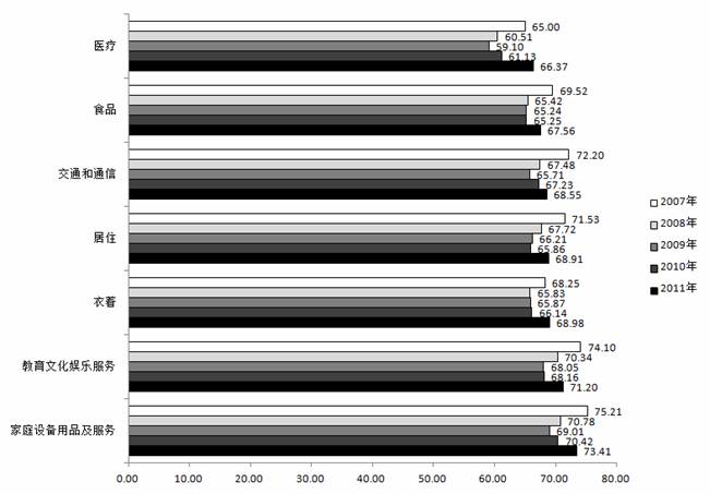 与2010年相比,七个大类消费品和服务满意度指数排序的主要变动体现在交通和通信类上。交通和通信类的排名从2010年的第3位下降到了2011年的第5位,而其他六个大类的相对排序没有变动。2010年七个大类消费品和服务按照满意度指数的排序依次为:家庭设备用品及服务类、教育文化娱乐服务类、交通和通信类、衣着类、居住类、食品类、医疗服务类。