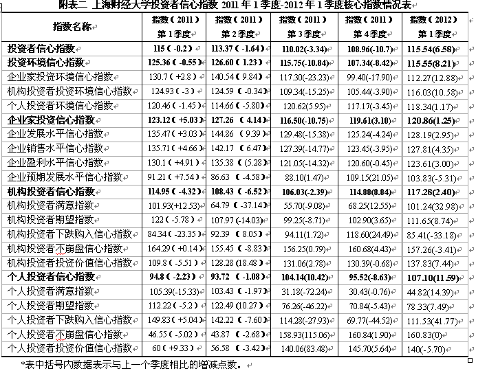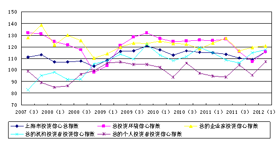 上海财经大学应用统计研究中心对上海市企业领导人或企业家、机构投资者和个人投资者的调查结果显示,2012年第一季度上海财经大学上海市投资者信心指数为115.54点,较上季度上升6.58点,与去年同期基本持平。该指数在持续五个季度下跌之后首次回升,表明投资者信心比前期有所增强,整体较为乐观。
