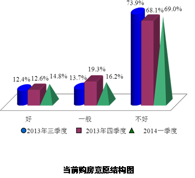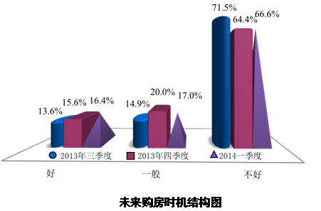 本季度是房地产第三轮调控政策实施的第四年,政府对房地产价格的调控态度未有动摇,综合近三个季度的调查结果来,消费者的购房意愿略有增强。本季度调查结果显示14.8%的消费者认为当前是购房的“好”时机,环比上升1.2点,同比下降1.2点;认为时机“不好”的则为69.0%,环比上升0.9点,同比下降幅度较大,为8.1点。综合来看,本季度消费者对于购房时机评价主要在“一般”和“不好”之间调整,说明消费者对当前楼市的看法在逐步转变,越来越多的消费者认为短期内房价不可能出现大幅波动。随着时间推移,调控作用逐步被市场所消化,同时在预期收入增加和推进城镇化进程等因素的作用下,使得上海市住房销量和价格一直保持上升态势,消费者一方面加大了房价继续上涨的预期,一方面对房价的接受度在逐步提高。