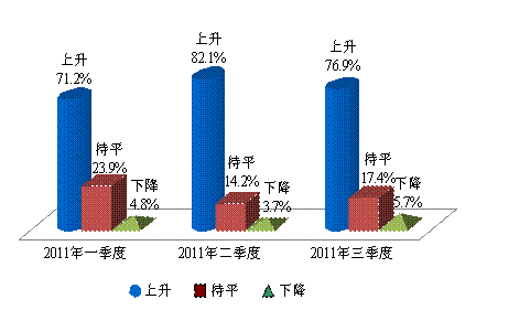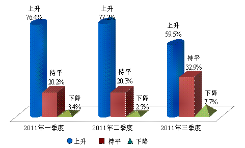 上海财经大学应用统计研究中心对2011年第三季度上海财经大学上海市消费者信心指数的调查结果显示,消费者对未来物价继续上涨的预期出现动摇,环比略有下降。