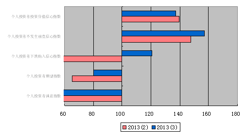 根据上海财经大学应用统计研究中心的调查,2013年第三季度上海财经大学上海市个人投资者信心指数为108.02点,比二季度降低大幅上升21.41点,同比上升15.53点。该指数重新回到乐观区域,表明上海市个人投资者群体对投资市场的看法转向积极,表现出谨慎的乐观。