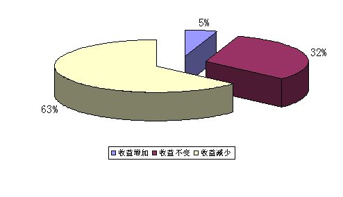 从投资收益来看,今年上半年基金公司偏股型基金的平均收益率均为亏损,且较大幅度地落后于上证指数。这正是造成本季度机构投资者满意指数大幅回落、态度转向消极的最主要原因。在本季度的调查中,有63%的受访者反映当月的投资收益比上月有所减少,32%的受访者表明当月投资收益基本没有变化,只有5%的受访者认为当月投资收益较上个月有所增加,如图6所示。