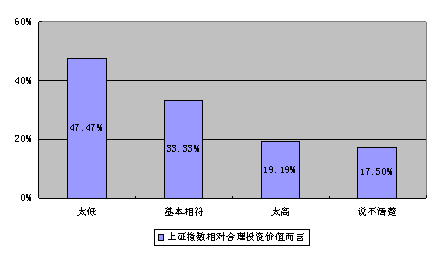 另外的两个分类指数则增幅明显,其中机构投资者投资价值信心指数128.28点,比上一季度大幅上升了18.48点,同比更是上升了28.28点。二季度调查中,有近一半的受访机构投资者认为当前的上证指数相对于合理的投资价值而言较低,有三分之一的受访机构投资者认为两者基本相符,只有两成左右的受访机构投资者认为当前的上证指数相对于合理的投资价值而言太高。数据表明,多数受访机构投资者对当前投资价值持积极乐观态度,如图7所示。本季度机构投资者下跌购入信心指数为92.39点,较一季度上升了8.05点,同比下降17.04点。该指数的波动幅度较前三个季度有所趋缓,但仍处于悲观区域。