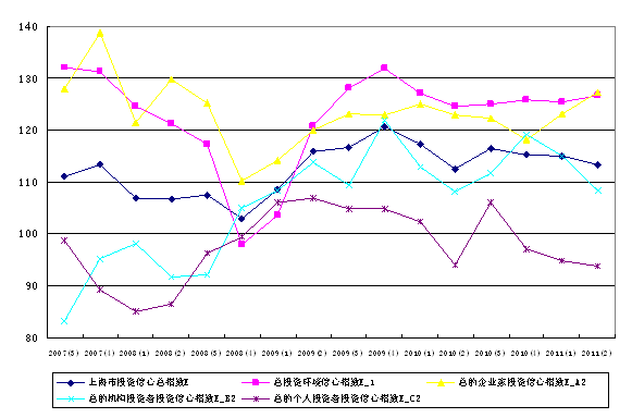 上海财经大学应用统计研究中心对上海市企业领导人或企业家、机构投资者和个人投资者的调查结果显示,2011年第二季度上海财经大学上海市投资者信心指数为113.37点,较上季度小幅下跌了1.64点,同比微升0.80点,总体仍然偏向乐观。