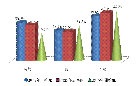 在2015年第四季度的调查中,24.6%的受访者认为房地产市场调控的政策有效,环比下降7.1点,有44.2%的消费者对该项工作的评价投了不满意票,比上季度增加了1.9个点,同比增加3.7点,可见今年以来消费者对房地产市场调控的满意度有所下降。