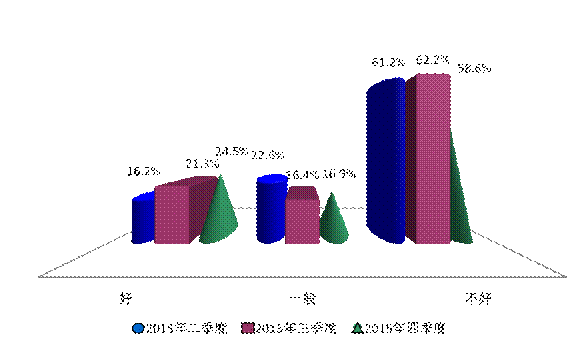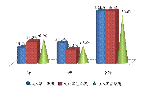 2015年第四季度政策面频繁发送鼓励房地产市场发展信号,一线城市反响强烈,消费者的购买意愿已体现在第四季度的调查结果中,调查结果显示24.5%的消费者认为当前是购房的“好”时机,环比继续上升了3.2点,同比上升5.3点,认为时机“不好”的则为58.6%,环比下降8.8点。