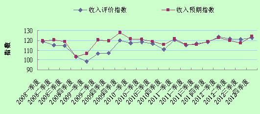 根据上海财经大学应用统计研究中心最新调查结果显示,消费者收入评价指数和预期指数总体来看,在本年度一直处于三年来的相对高位。2012年四个季度收入评价指数分别为123.5点、121.6点、120.8点和122.4点,本季度环比增加1.6点,同比上升3.9点;收入预期指数分别为122.5点、120.0点、117.2点和124.0点,环比大幅提高6.9点,同比增长5.1点。说明十八大提出的十年收入倍增计划和逐渐回暖的经济形势对消费者收入评价,尤其是预期收入评价起到了明显的提振作用,出现了向好预期。