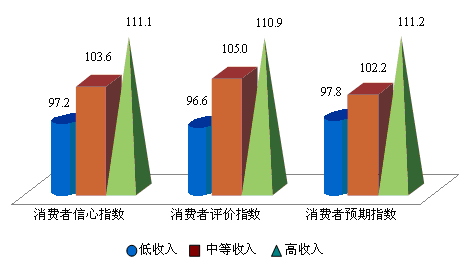 但是不同收入群体对于收入的评价和预期表现出不同的态度,低收入群体的收入评价指数为111.3点,环比下降了6.8点,同比增长2.7点,收入预期指数112.1点,环比提高1.7点,同比上升2.4点;中等收入群体收入评价指数和预期指数分别为121.5点和121.3点,环比分别提高1.6点和6.3点,同比上涨5.7点和4.4点;高收入群体的收入评价指数为125.1点,环比上升1.6点,同比下降0.7点,收入预期指数126.7点,环比提高5.9点,同比增加2.1点。可见各个收入群体对收入的预期环比同比均有所增加,说明提高收入水平的政策导向和经济发展向好的预期使得消费者对未来收入均充满信心。但低收入群体的收入评价指数和预期指数的绝对水平和相对增长都处于调查总体中的最低水平,而中等收入群体两项指数的增幅最大。上海市关于收入调节和发展中等收入群体的措施得到了消费者的认知和认可,但对低收入群体应给予更多的关注,尤其是要提高中小企业、劳动密集型企业中一线劳动者和退休人员等低收入群体的收入水平。