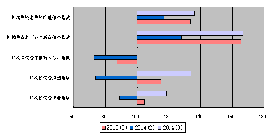 根据上海财经大学应用统计研究中心的调查,2014年第三季度上海财经大学上海市机构投资者信心指数为129.44点,比二季度上升34.3点,同比提高9.62点。指数大幅回升至乐观区域,表明本季度机构投资者信心显著提振。