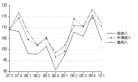 根据上海财经大学应用统计研究中心对上海市消费者的调查,2010年第一季度上海市高、中和低收入消费者的消费信心指数分别为111.9点、110.7点和104.2点,与上季度相比均有所下调,其中低收入消费者消费信心调整明显,下降幅度达11.6点,其与高收入消费群体的信心差值达到7.7点,对此现象应给予必要的关注。