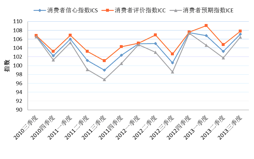 根据上海财经大学应用统计研究中心最新调查结果显示,2013年第三季度上海财经大学上海市消费者信心指数为107.1点,环比上涨3.9点,同比增加6.5点。其中,消费者评价指数为107.8点,较上季度增长3.1点,同比上升5.2点。消费者预期指数为106.4点,环比增加4.7点,同比上涨7.8点,具体数据见附表1。本季度各项主要指标呈现全面回升态势,这主要是因为三季度以来宏观经济数据回升明显,拉动经济发展的“三驾马车”都呈现加速态势,我国经济发展实现软着陆,同时上海自贸区的成立也将为十一月的十八届三中全会新的改革拉开序幕,使得消费者对于未来经济发展充满信心。同时近一年各项指标都超过中性值100点,说明消费者对政府采取的创新驱动转型发展战略、稳定的货币政策和以转变政府职能为突破口的深化改革政策持积极的态度。
